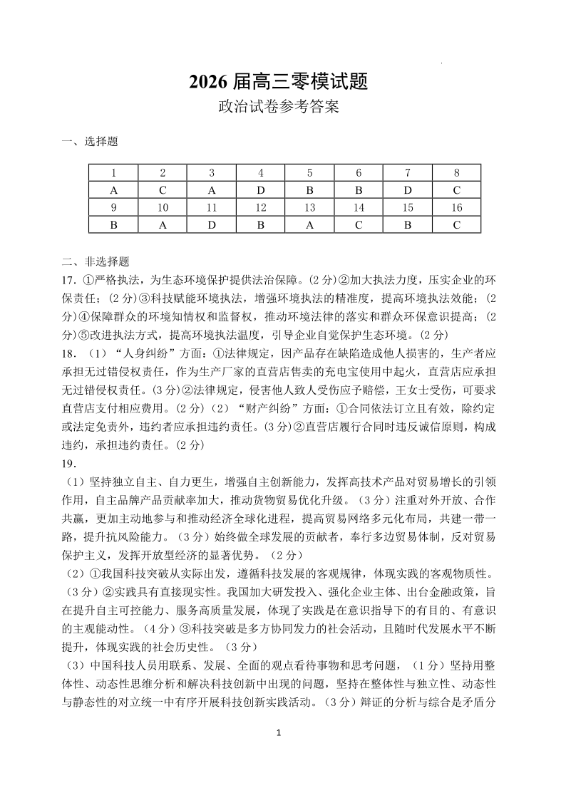 哈尔滨市第一中学、第六中学2026年2月高三零模模拟考试 政治答案.pdf