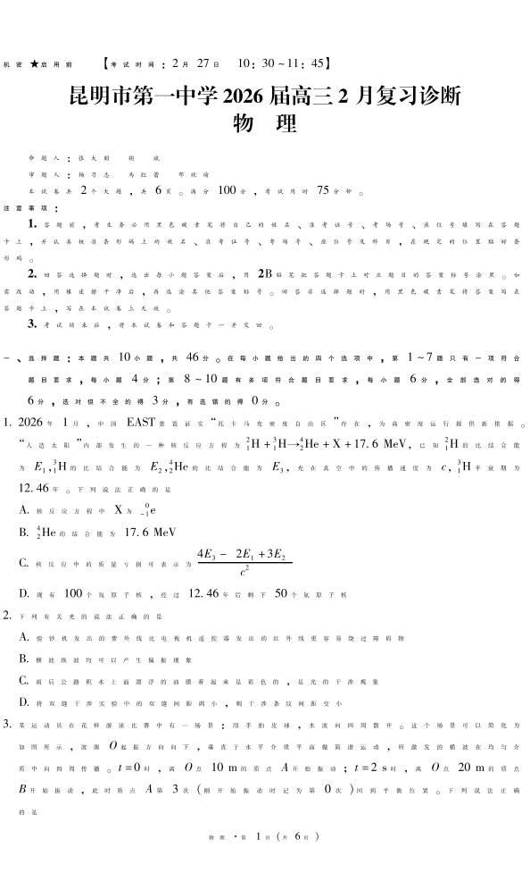 昆明市第一中学2026届高三2月复习诊断 物理.pdf