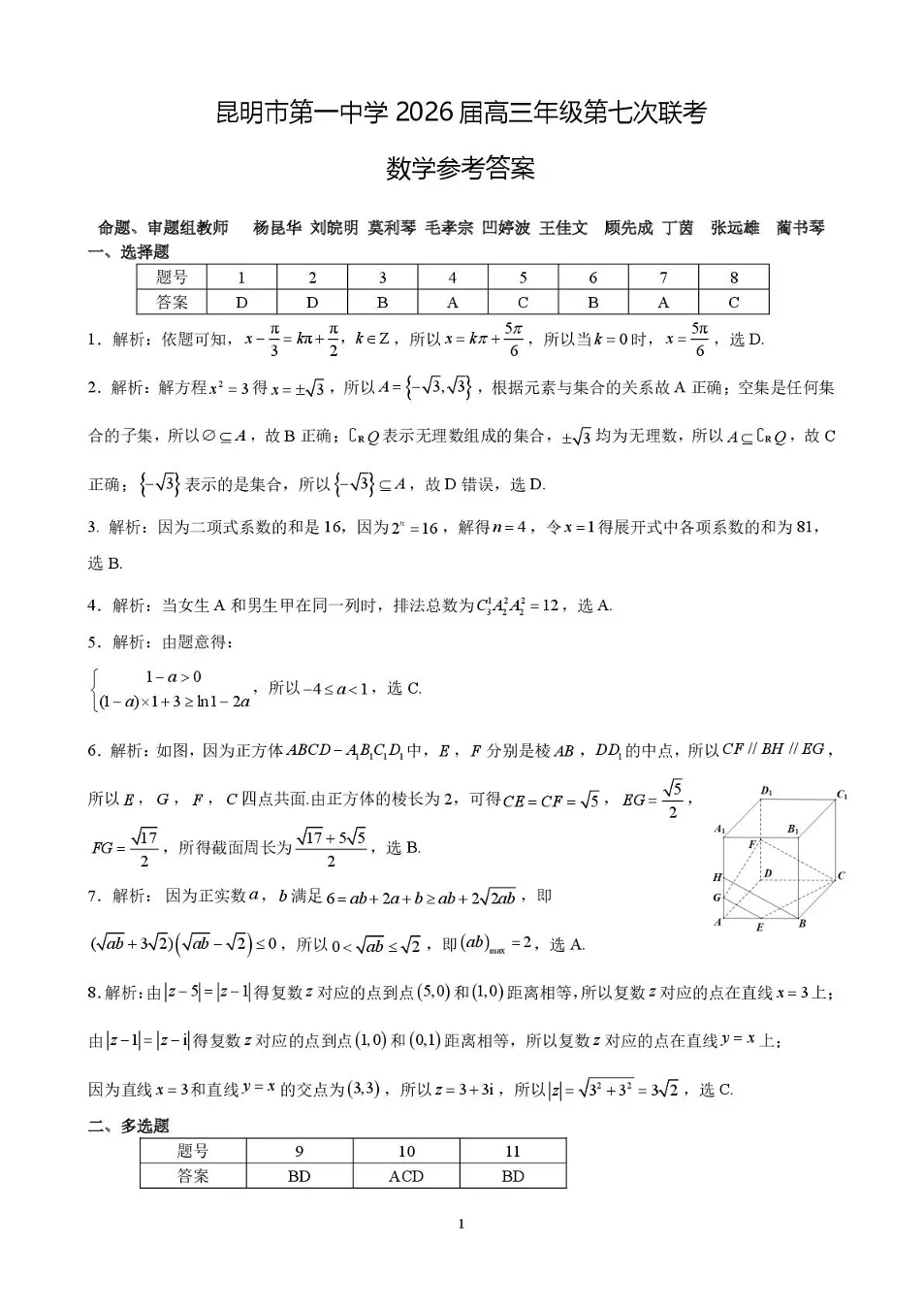 昆明市第一中学2026届高三2月复习诊断 数学答案.pdf