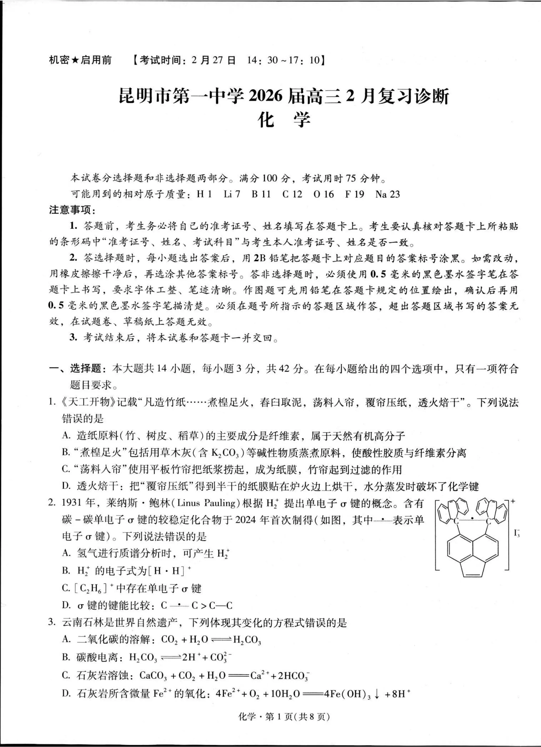 昆明市第一中学2026届高三2月复习诊断 化学.pdf