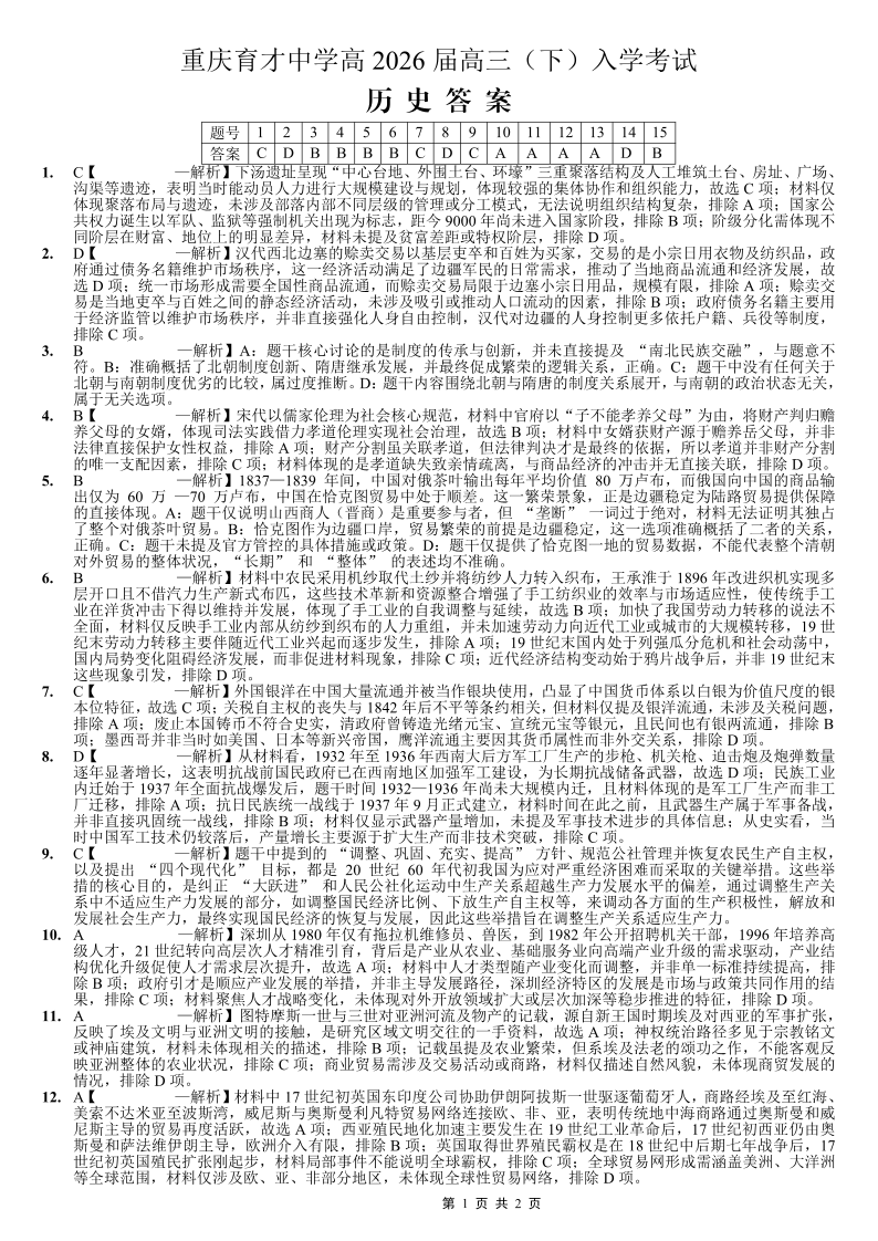 重庆育才中学高2026届高三(下)入学考试 历史答案.pdf