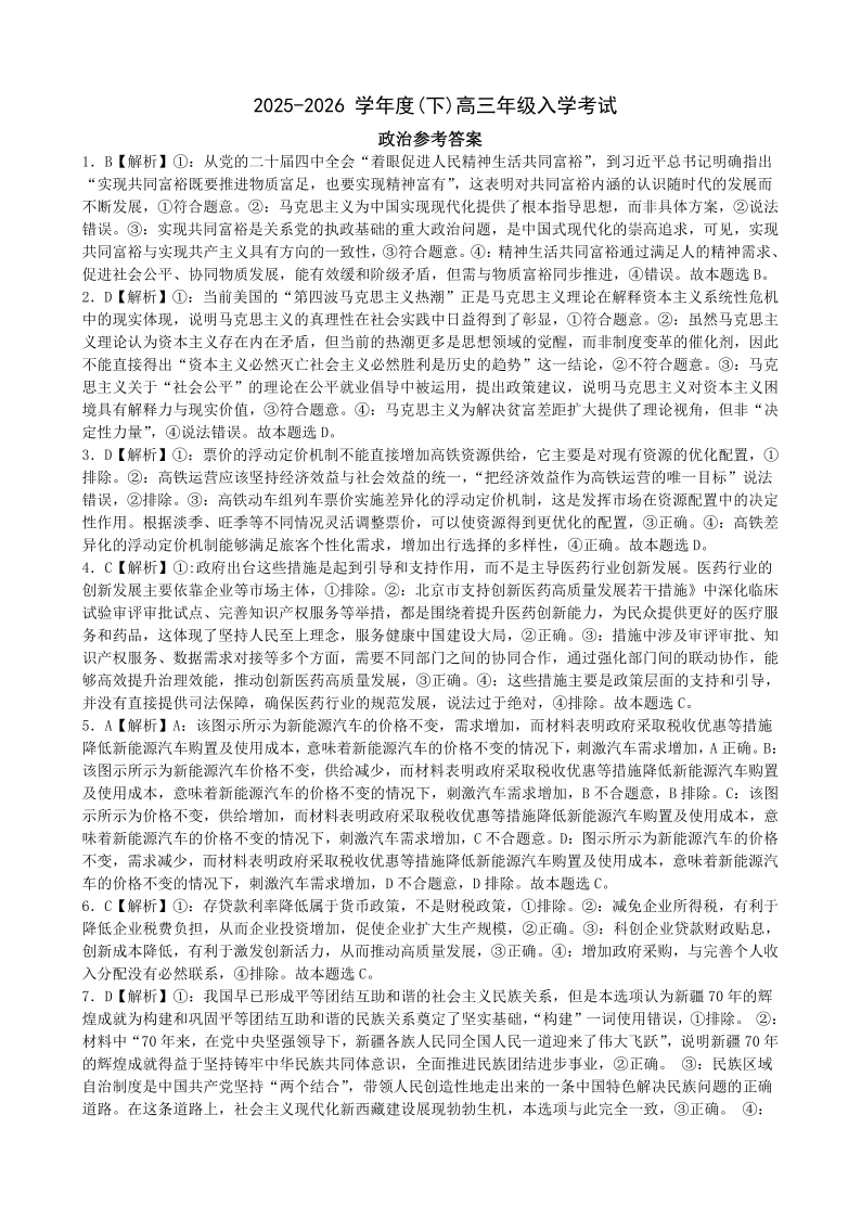 重庆市第八中学校2025-2026学年度(下)高三年级入学考试 政治答案.pdf