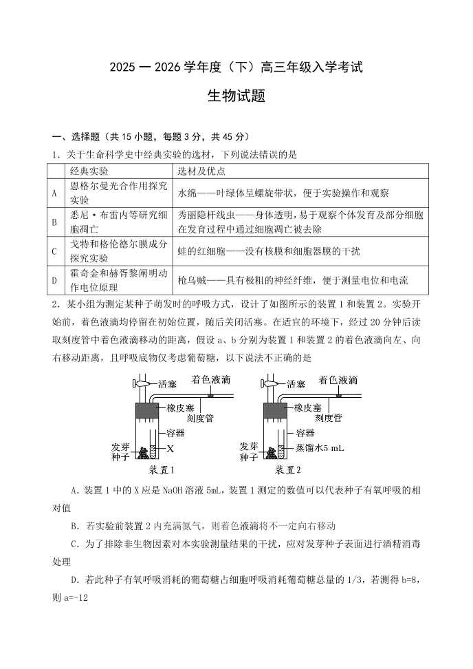 重庆市第八中学校2025-2026学年度(下)高三年级入学考试 生物.pdf