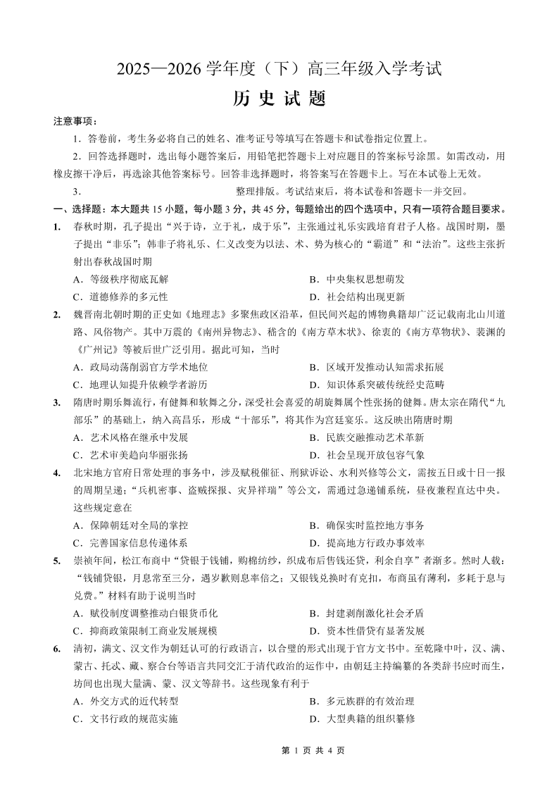 重庆市第八中学校2025-2026学年度(下)高三年级入学考试 历史.pdf