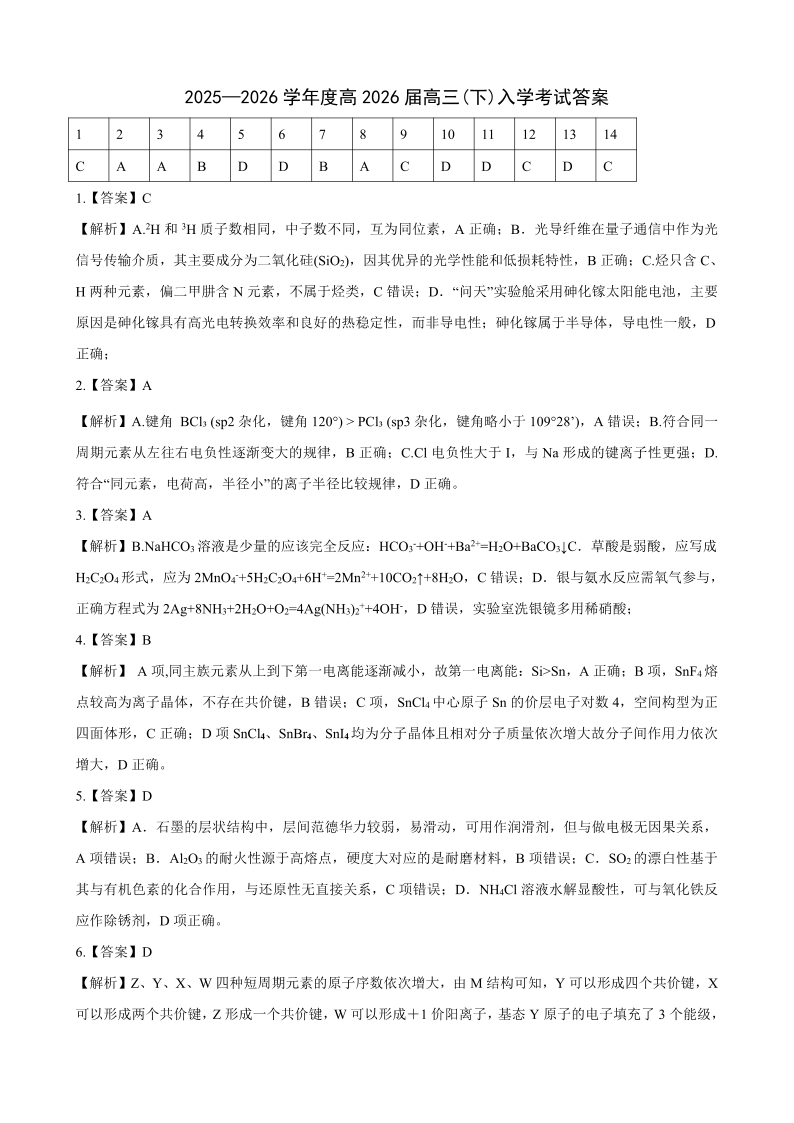 重庆市第八中学校2025-2026学年度(下)高三年级入学考试 化学答案.pdf