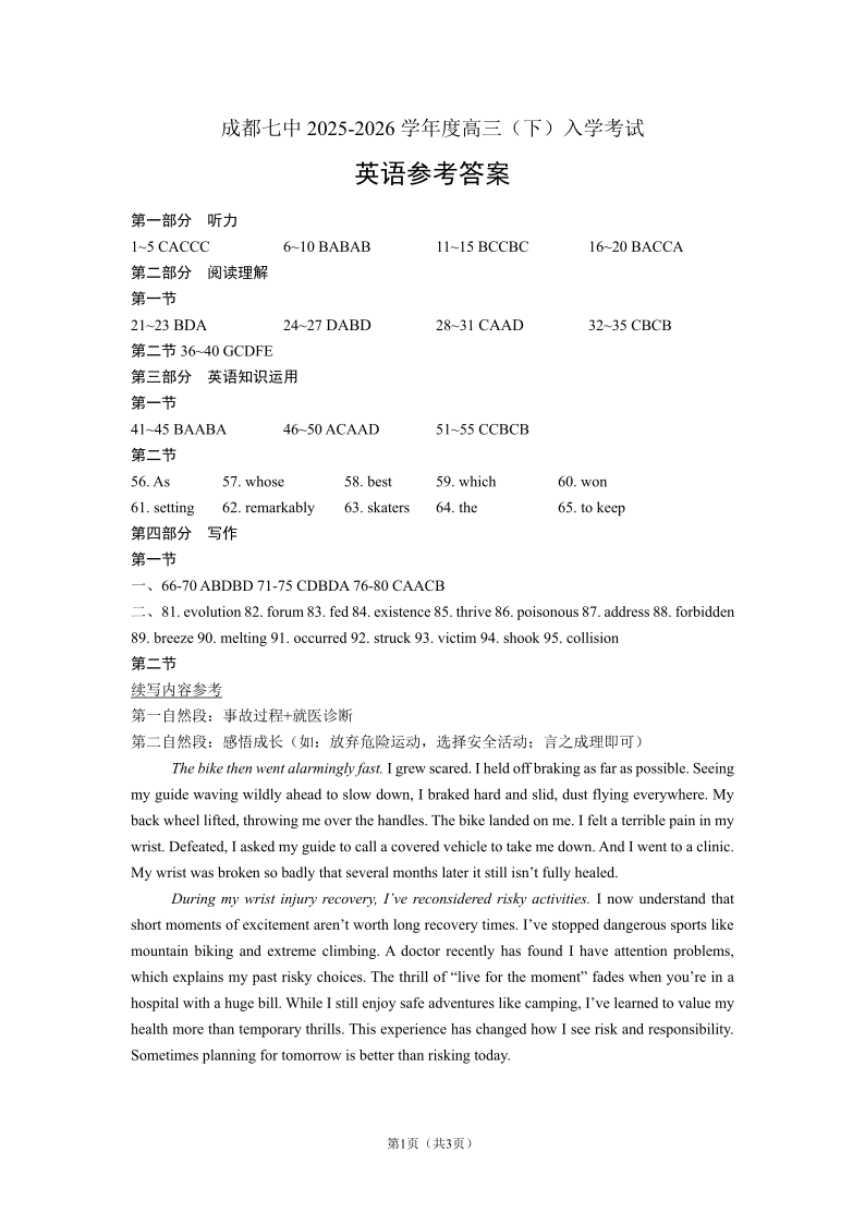 成都市第七中学2025—2026学年度下期高2026届开学考试 英语答案.pdf