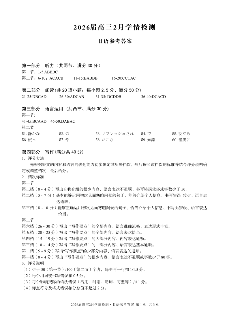 安徽省·A10联盟2026届高三下学期2月学情检测 日语答案.pdf