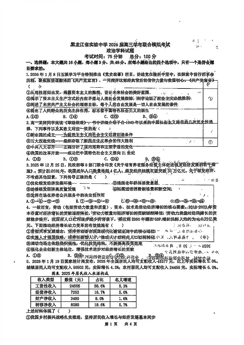 黑龙江省实验中学2026届高三学年联合模拟考试 政治.pdf