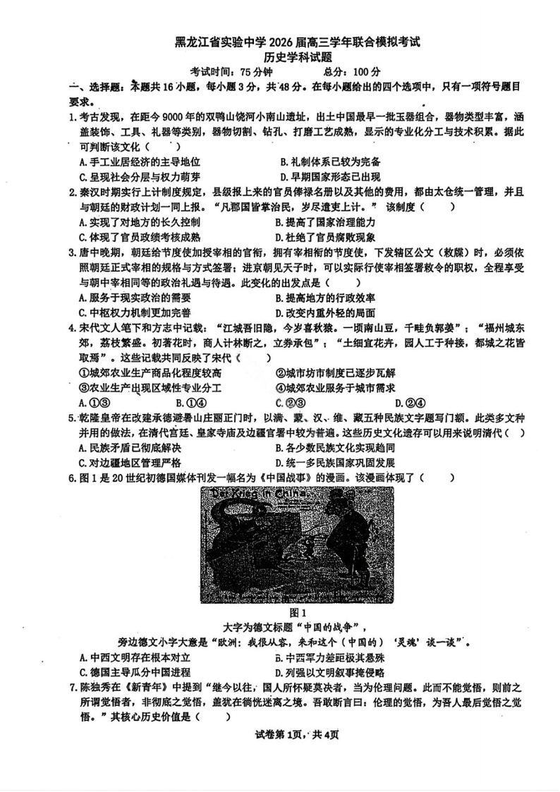 黑龙江省实验中学2026届高三学年联合模拟考试 历史.pdf