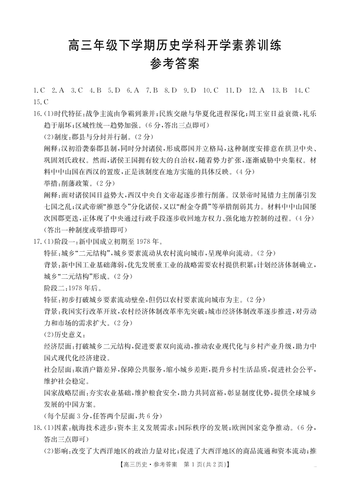 江西省2025-2026学年高三下学期2月开学素养训练 历史答案.pdf