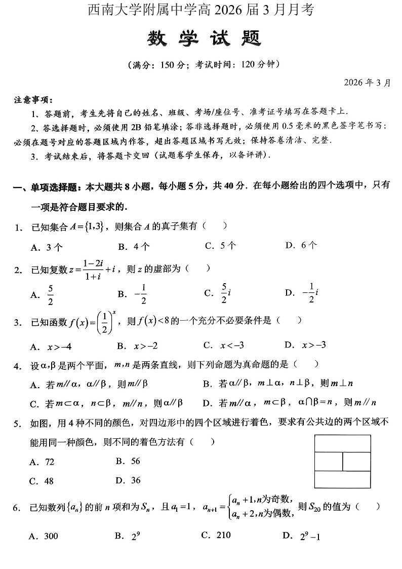 重庆西南大学附中高2026届高三下3月定时检测 数学.pdf
