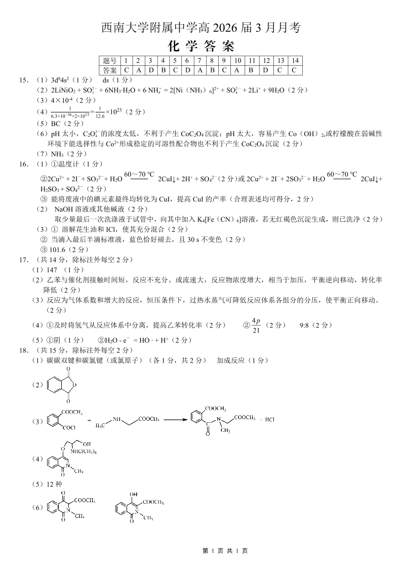 重庆西南大学附中高2026届高三下3月定时检测 化学答案.pdf