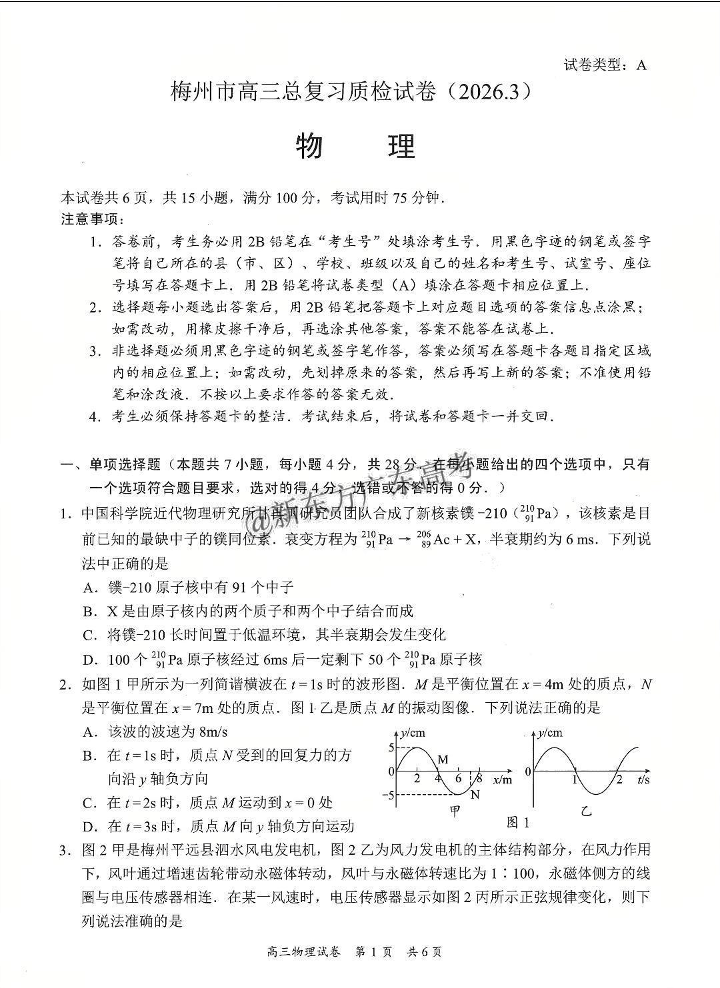 广东省梅州市高三总复习质检试卷(2026.3)物理.pdf