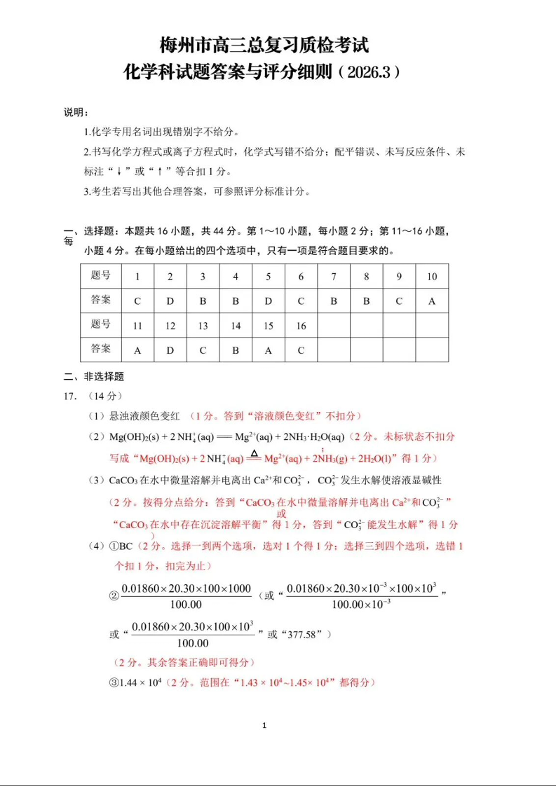 广东省梅州市高三总复习质检试卷(2026.3)化学答案.docx