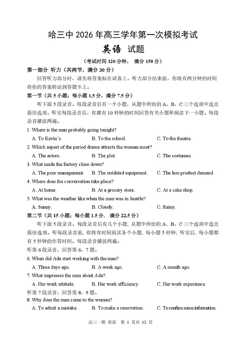哈三中2026年高三学年第一次模拟考试 英语.pdf