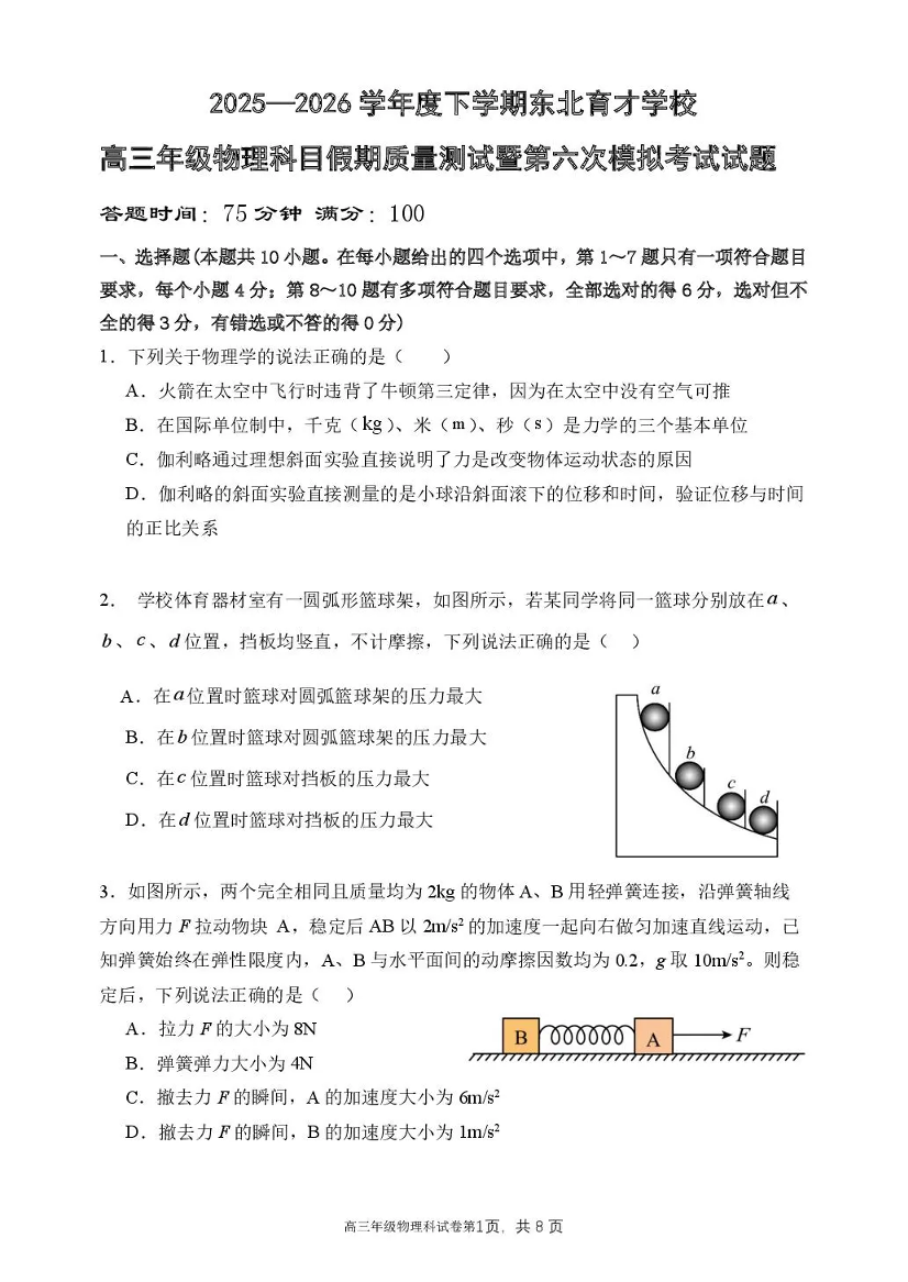 东北育才学校2025-2026学年高三下学期第六次模拟考试 物理.pdf