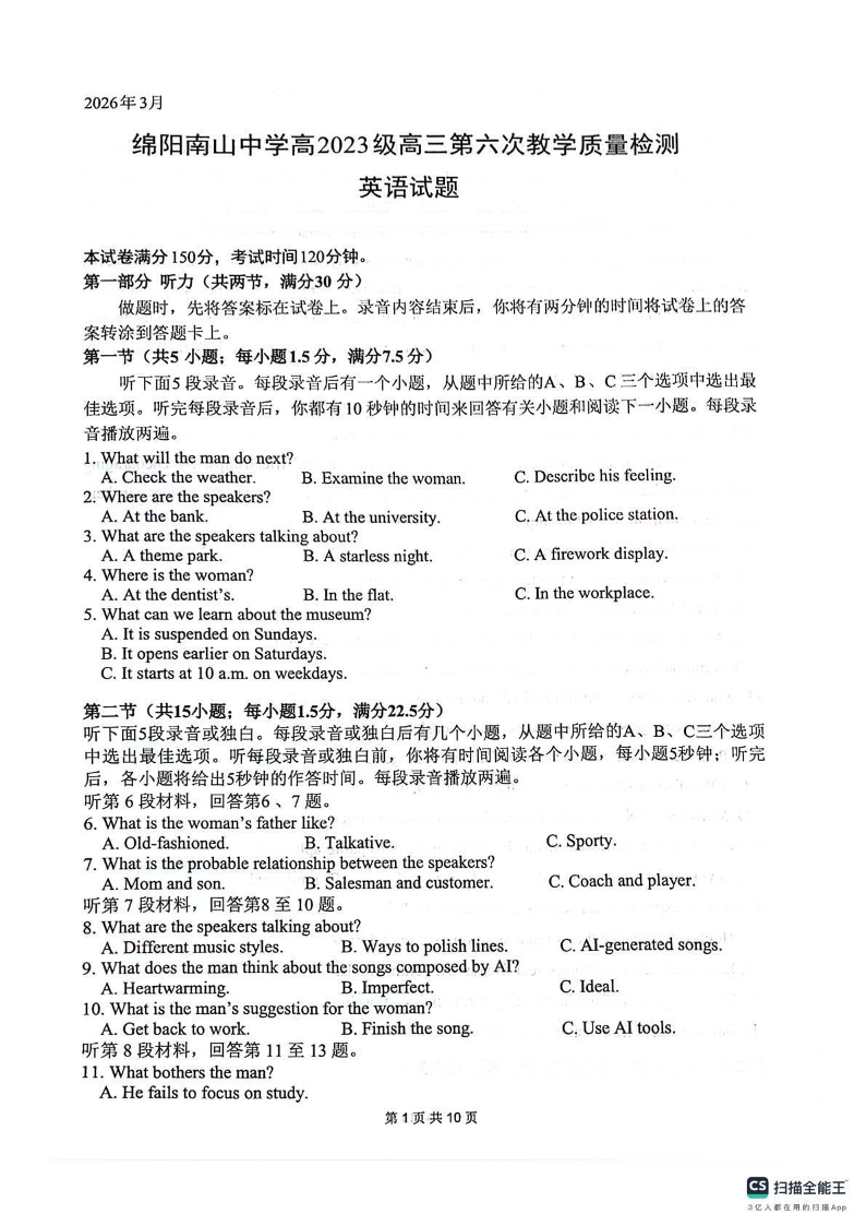 绵阳南山中学高2023级高三第六次教学质量检测 英语.pdf