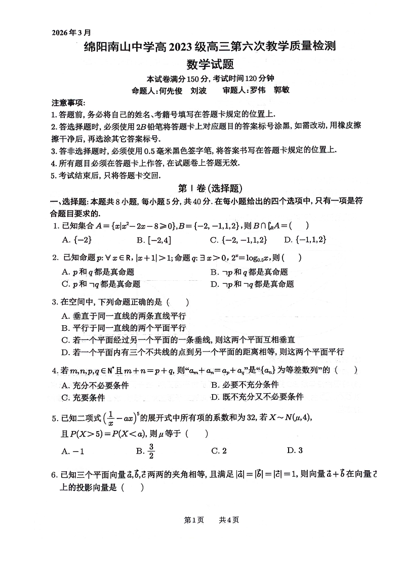 绵阳南山中学高2023级高三第六次教学质量检测 数学.pdf