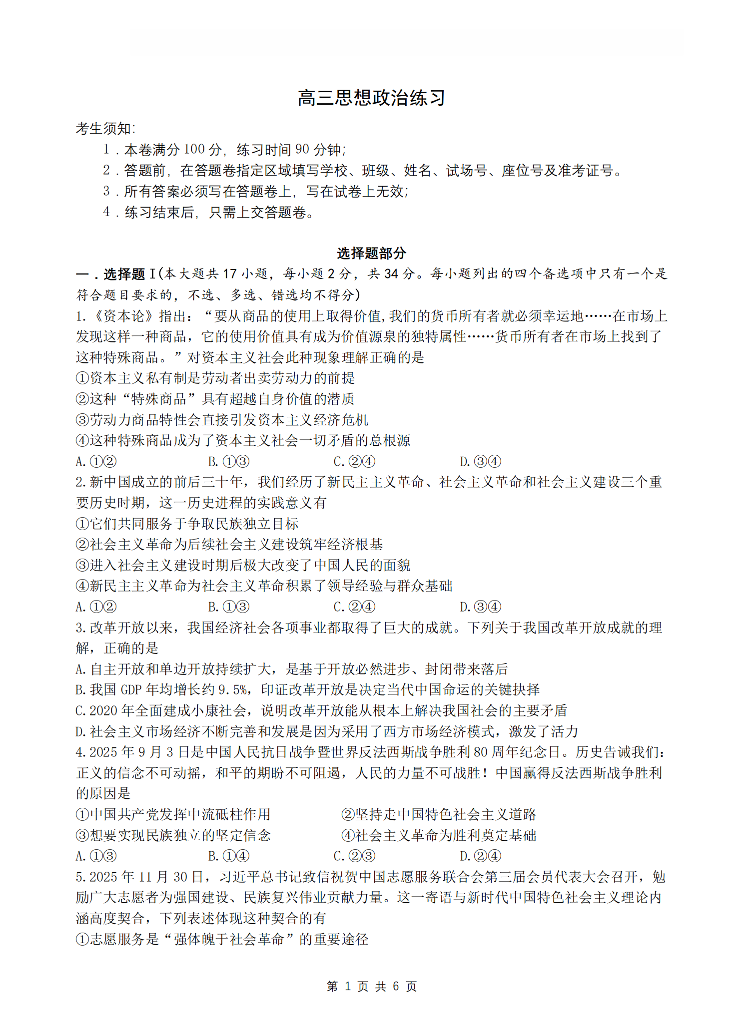 浙江省名校协作体G12联盟2026届高三下学期开学练习 政治.pdf