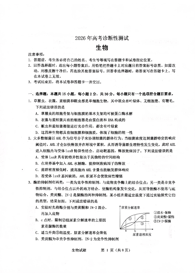 烟台市2026年高考诊断性测试 生物试题(含答案).pdf