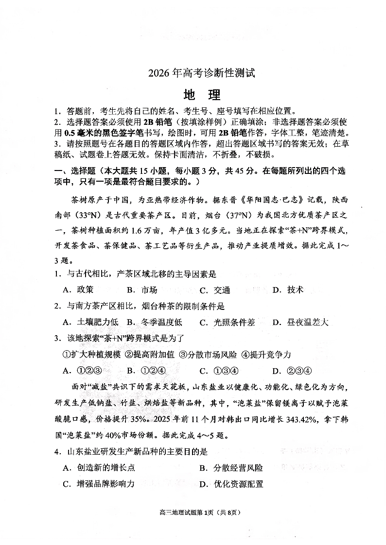烟台市2026年高考诊断性测试 地理试题(含答案).pdf