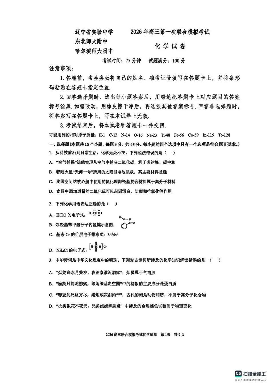 东北三省三校2026年高三第一次联合模拟考试 化学.pdf