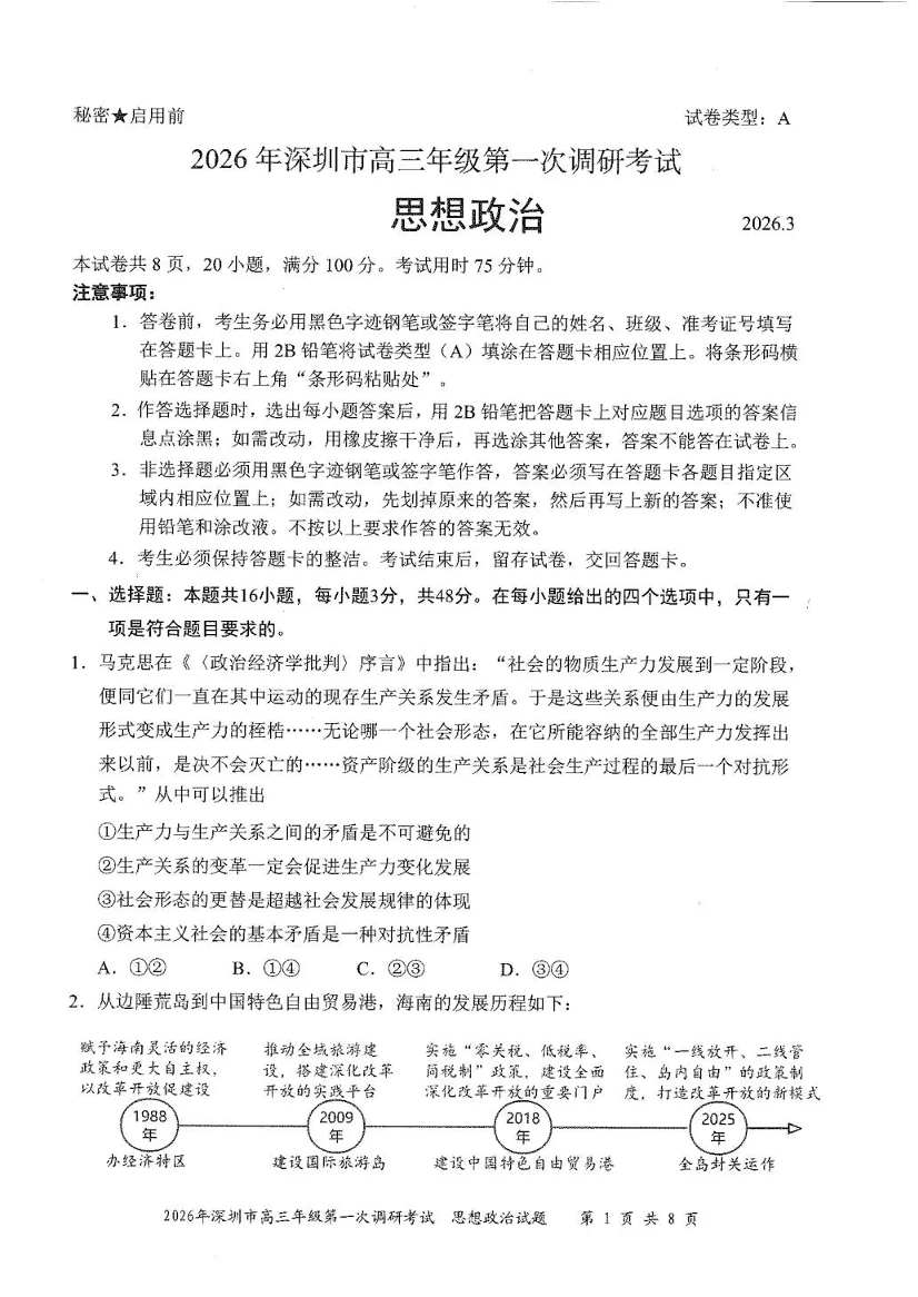 2026年深圳市高三年级第一次调研考试 政治.pdf