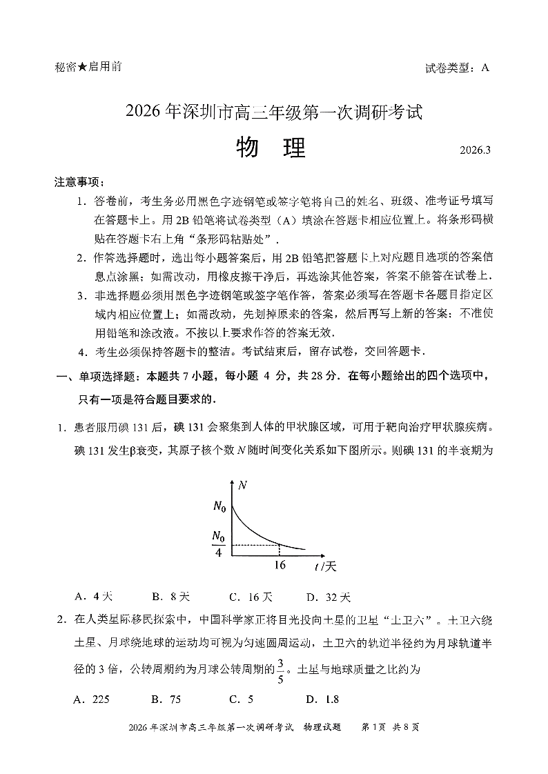 2026年深圳市高三年级第一次调研考试 物理.pdf
