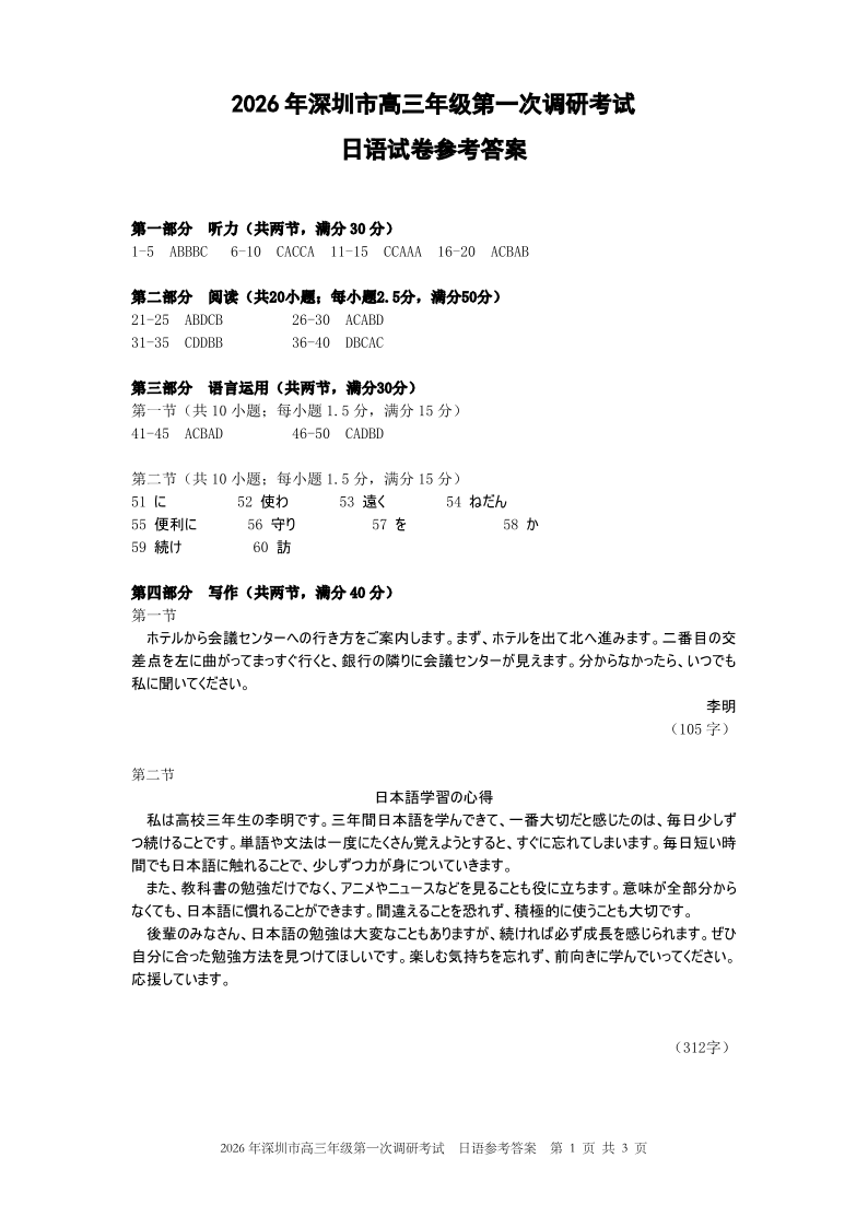 2026年深圳市高三年级第一次调研考试 日语答案.pdf