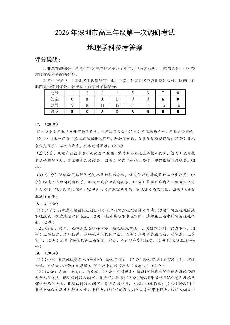 2026年深圳市高三年级第一次调研考试 地理答案.pdf