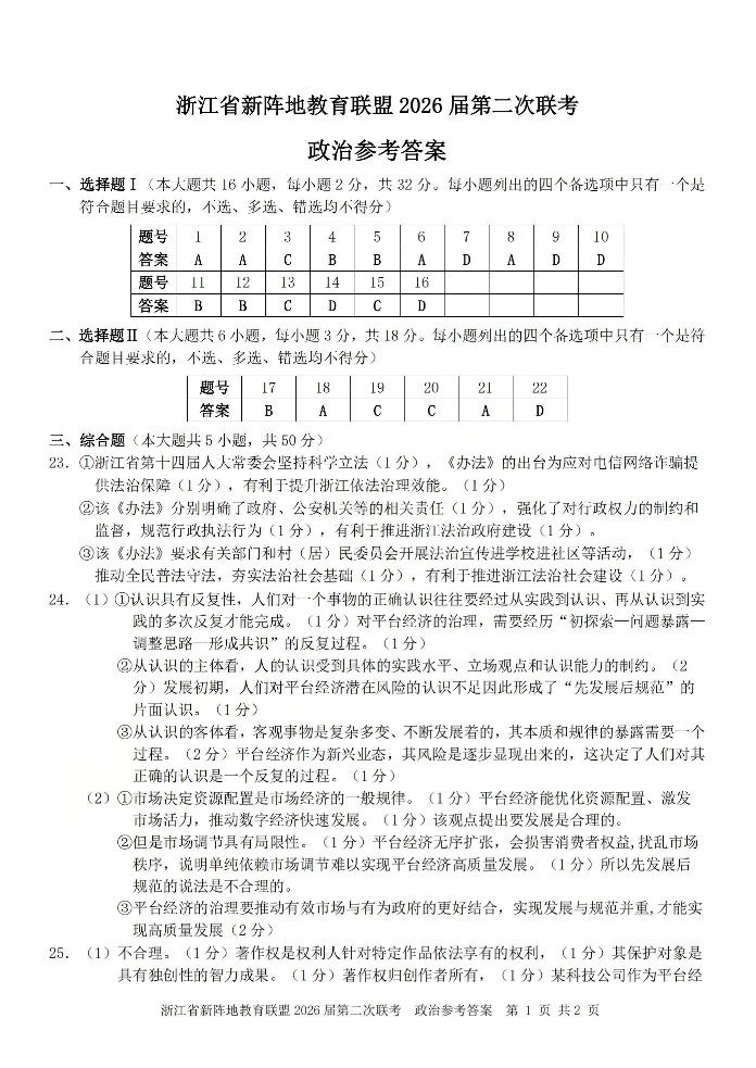 浙江省新阵地教育联盟2026届第二次联考 政治答案.pdf