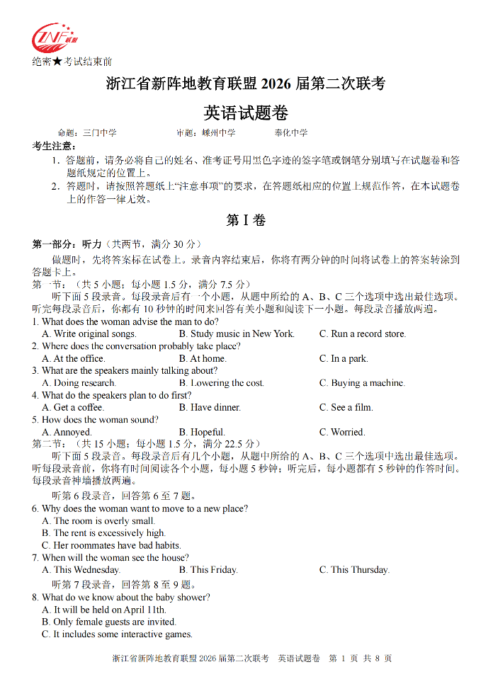 浙江省新阵地教育联盟2026届第二次联考 英语.pdf