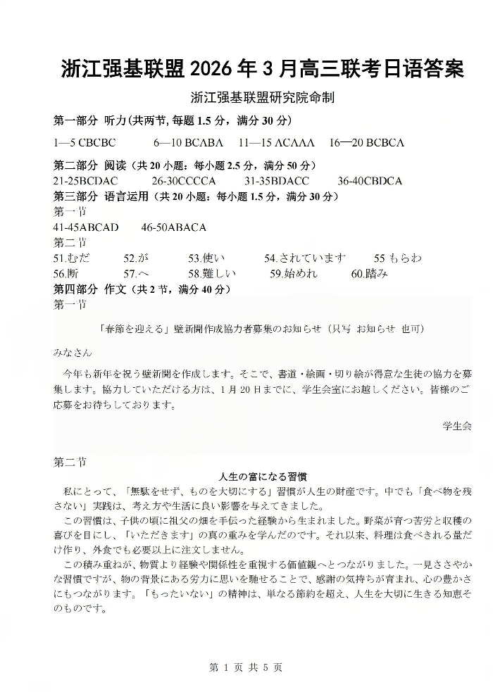 浙江强基联盟2026年3月高三联考 日语答案.pdf