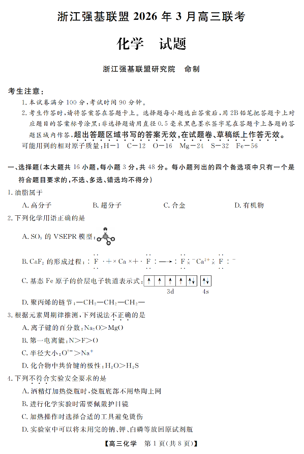 浙江强基联盟2026年3月高三联考 化学.pdf