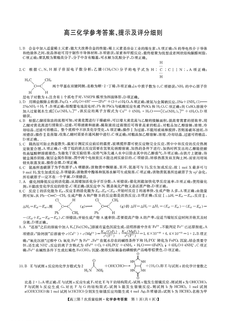 九师联盟2026届高三第7次质量检测 化学答案.pdf
