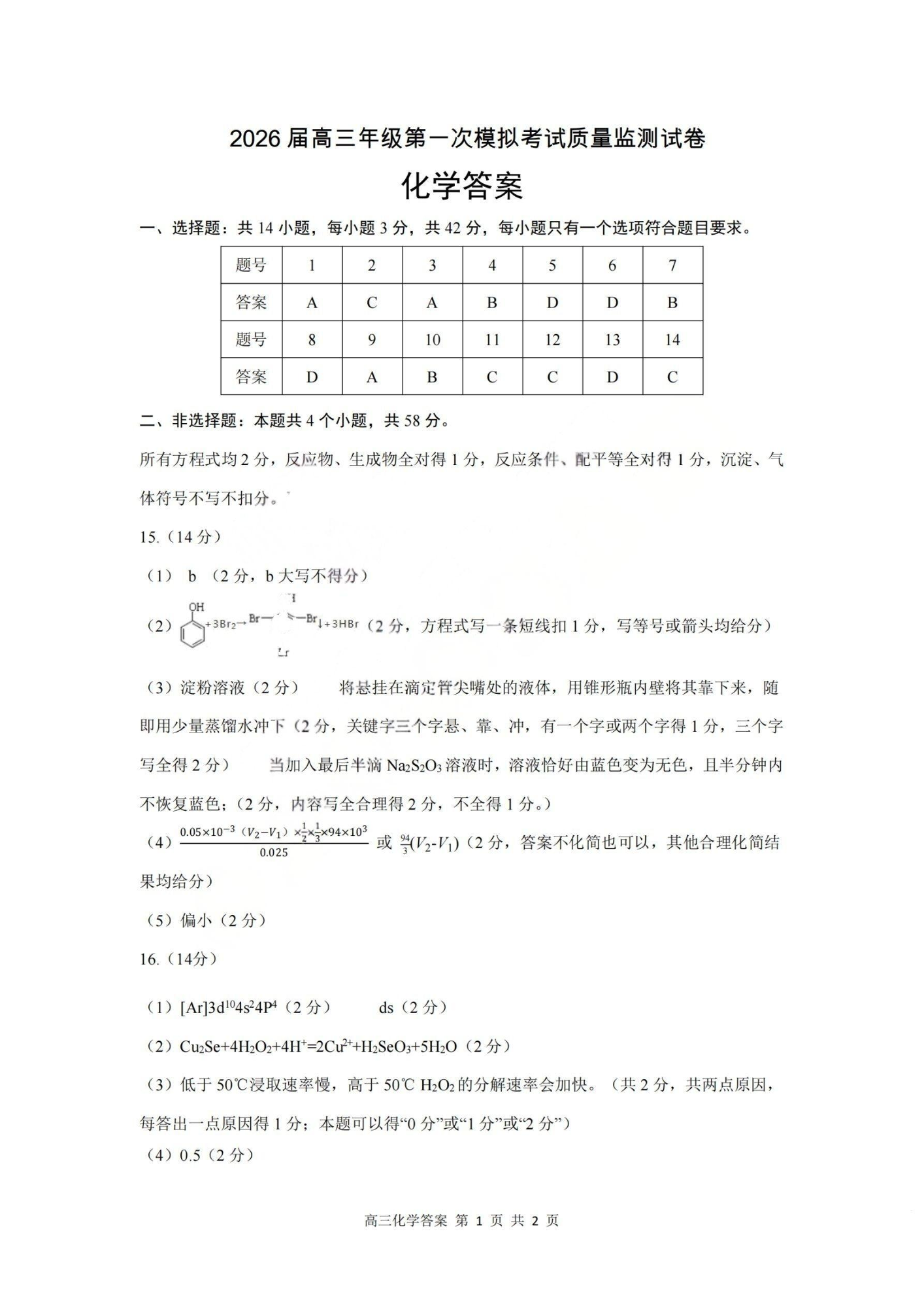 2026届高三年级第一次模拟考试质量监测试卷 化学答案.pdf