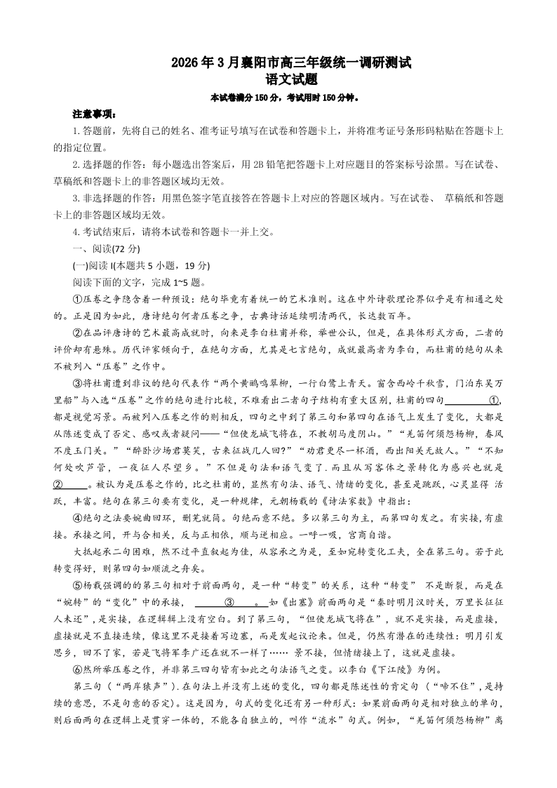 2026年3月襄阳市高三年级统一调研测试 语文.pdf