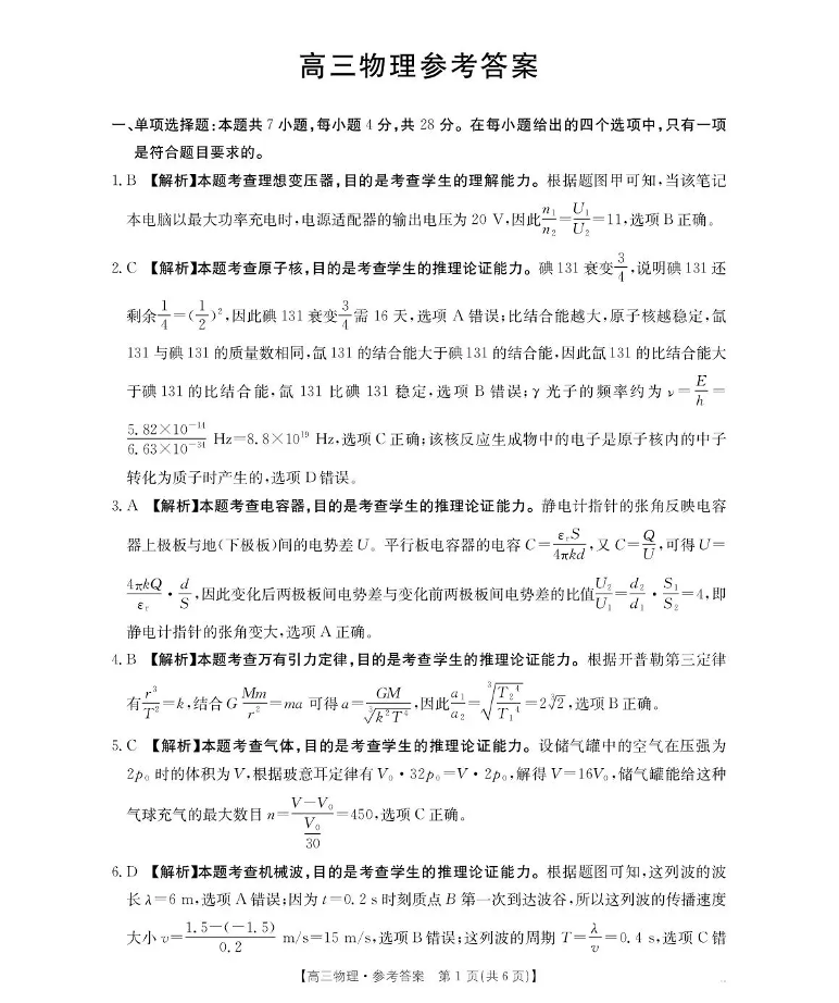 河南省2026届高三下学期3月开学联考 物理答案.pdf