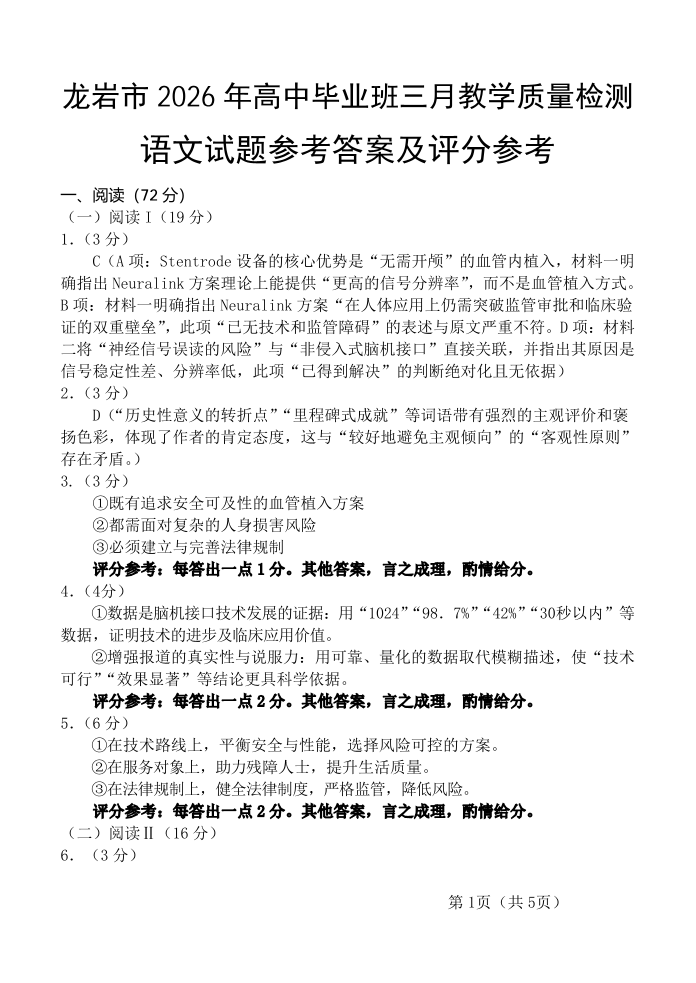 龙岩市2026年高中毕业班三月教学质量检测 语文答案.pdf