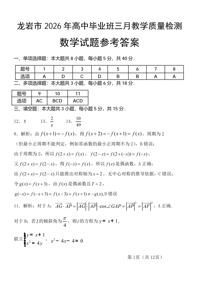 龙岩市2026年高中毕业班三月教学质量检测 数学答案.pdf