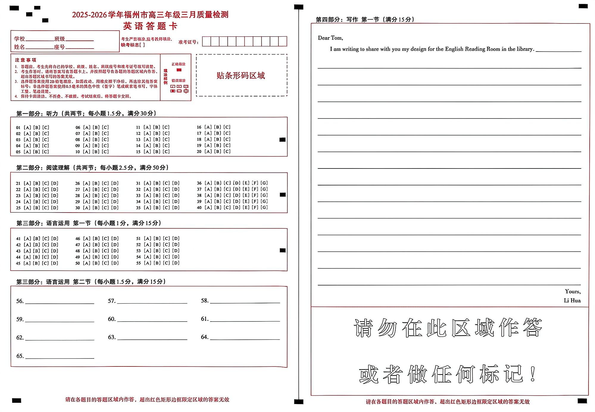 2025-2026学年福州市高三年级三月质量检测 英语答题卡.pdf