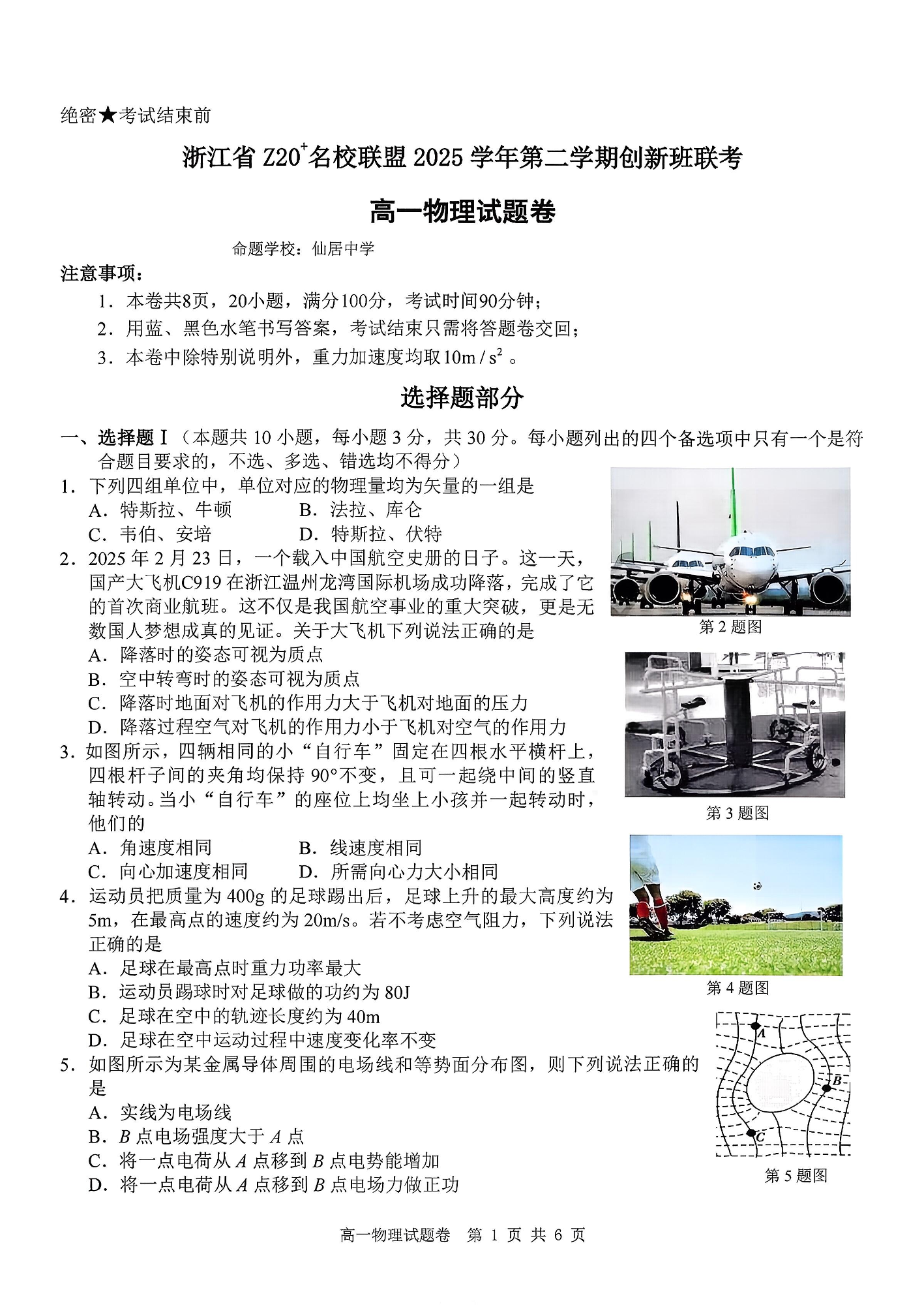 浙江省Z20名校联盟2025-2026学年高一创新班开学联考 物理试题(含答案).pdf