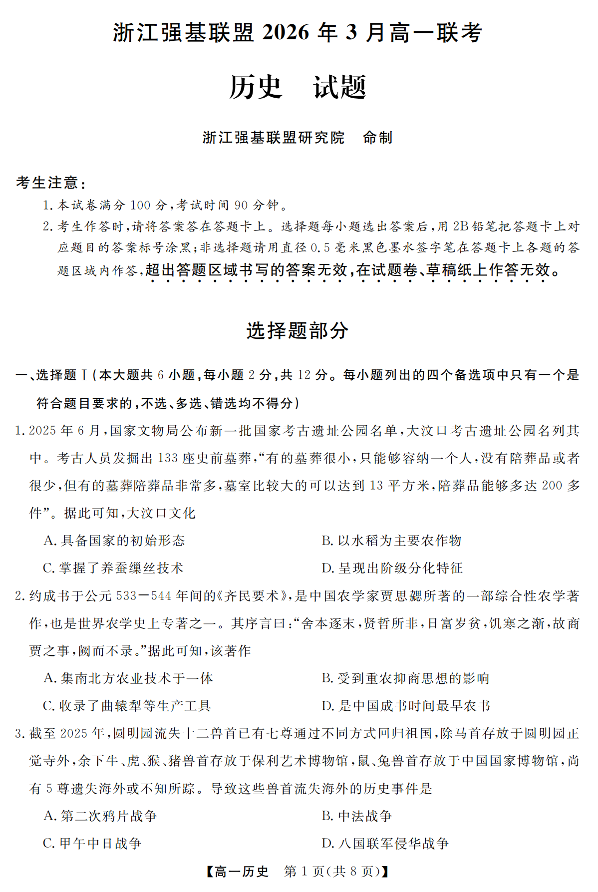 浙江强基联盟2026年3月高一联考 历史.pdf
