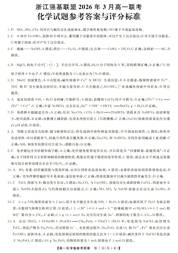 浙江强基联盟2026年3月高一联考 化学答案.pdf