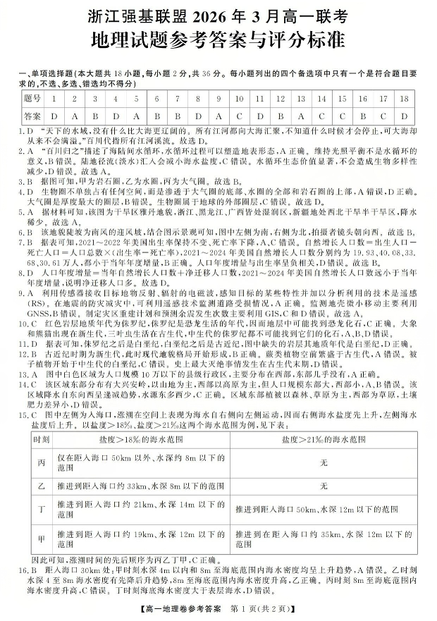 浙江强基联盟2026年3月高一联考 地理答案.pdf