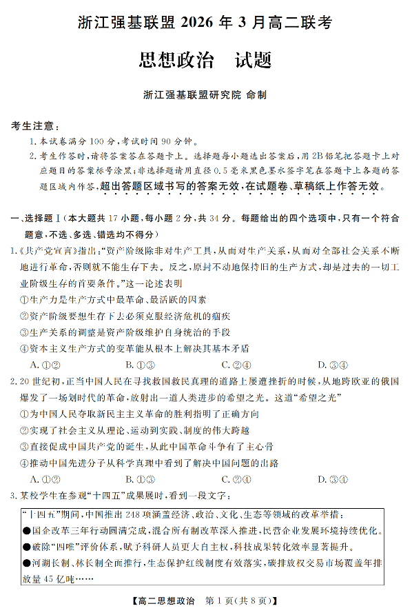 浙江强基联盟2026年3月高二联考 政治.pdf