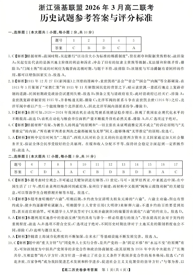 浙江强基联盟2026年3月高二联考 历史答案.pdf