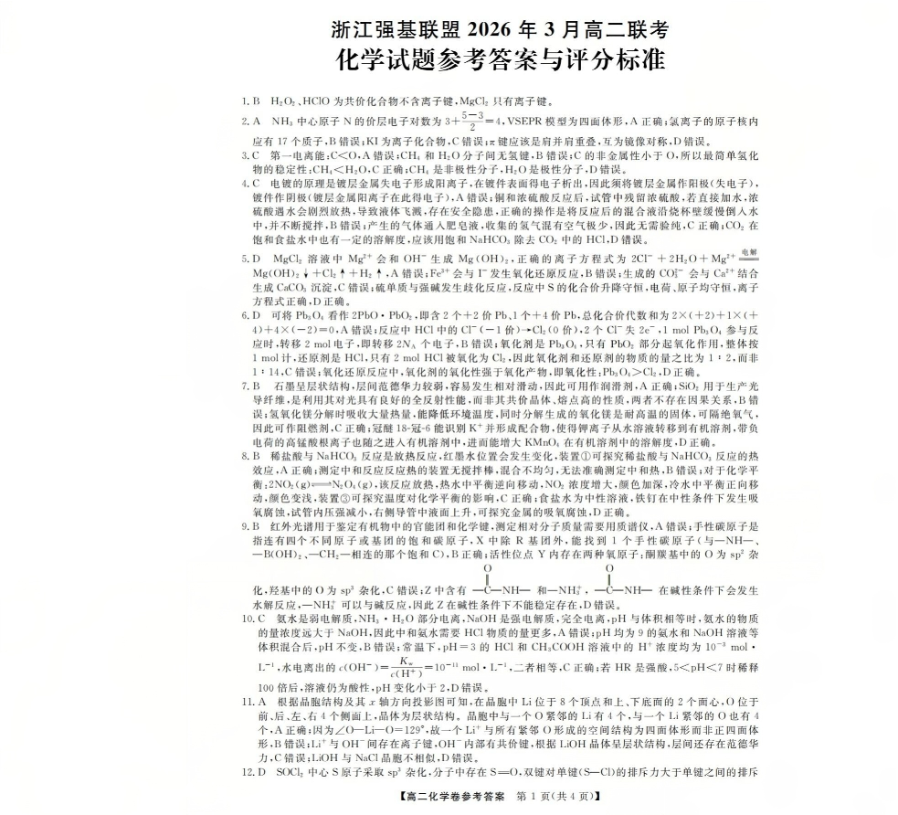 浙江强基联盟2026年3月高二联考 化学答案.pdf