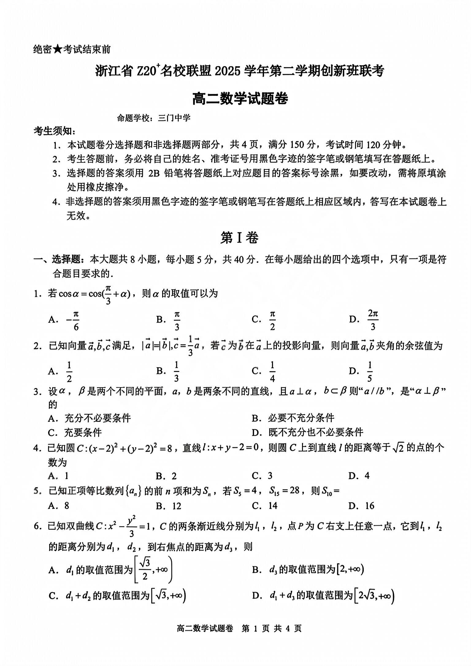 浙江省Z20名校联盟2025-2026学年高二创新班开学联考 数学试题(含答案).pdf