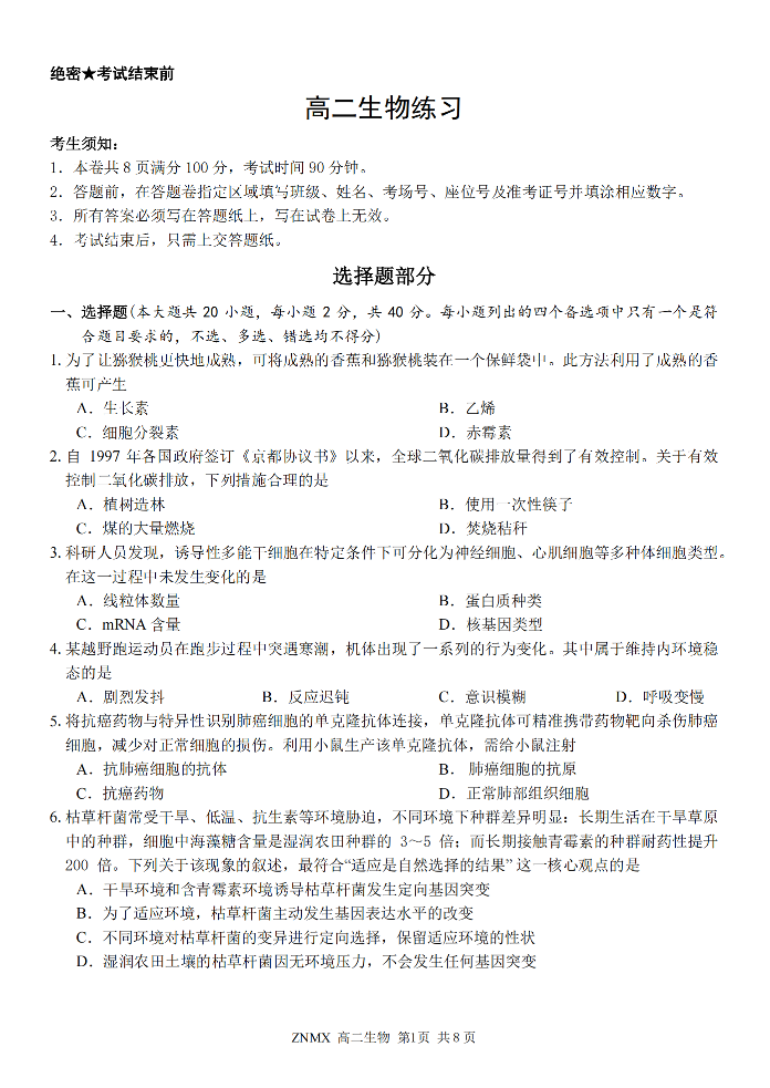 浙南名校联盟2026年高二年级下学期返校(开学)考试 生物.pdf